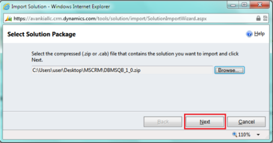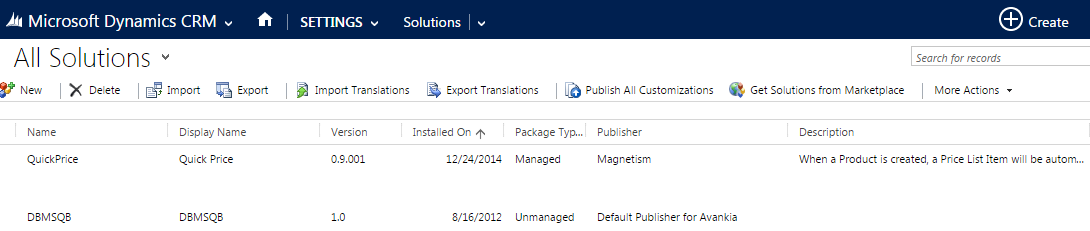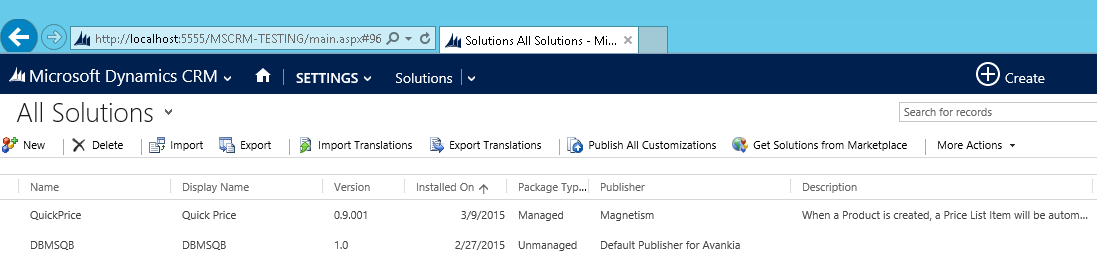 - Upload the zipped "DBMSQB_X.zip" solution package & "QuickPrice_0_9_001_managed.zip" to your Microsoft Dynamics 365/CRM On-Premise instance as shown. Settings > Customizations > Solutions > Import.