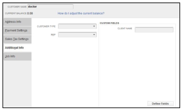 - Create Custom field in QuickBooks by clicking Edit-> Define fields under Additional info tab on the Customer layout as shown below: