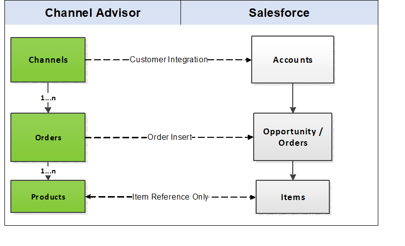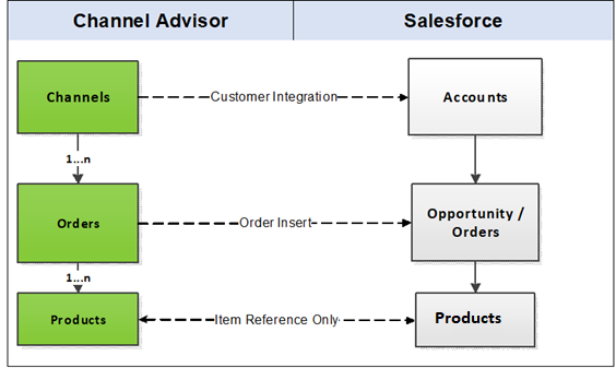 - Order Integration: The Order integration data flow constitutes retrieving data from the Order object of ChannelAdvisor and integrating it with Salesforce as Opportunity/Order.