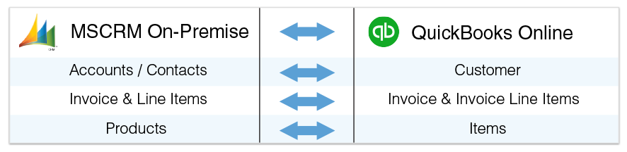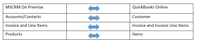 Data flow of Bi-directional integration between Microsoft Dynamics 365/CRM On-Premise & QuickBooks Online is shown in the table below: