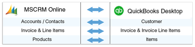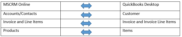 Data flow of Bi-directional integration between Microsoft Dynamics 365/CRM Online & QuickBooks Desktop is shown in the table below.