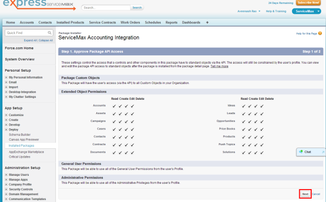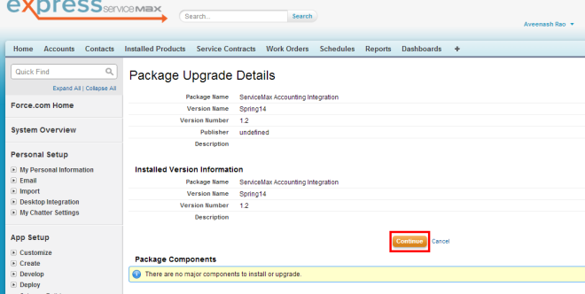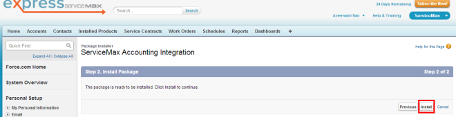 DBSync Package ServiceMax Accounting Integration must be installed in ServiceMax Salesforce Instance. Pre-requisites and the steps involved in the installation are explained in this section.