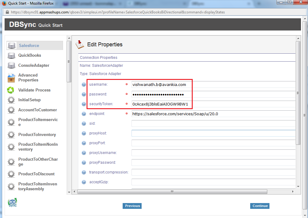 - You can also use Advanced Properties tab to connect to your Salesforce instance. Go to Advanced Properties, fill in the Salesforce Username, Password and Security Token of your Salesforce Instance. Select the appropriate End Point. Once you enter all the required details, click on Validate Connection. If the validation is successful, click on Save to Save the Salesforce details. If the validation fails, you will see Validation Errors on the top right corner. Review details in the Validation Errors section and make the necessary changes in Advanced Properties. Click on Validate Connection again.
