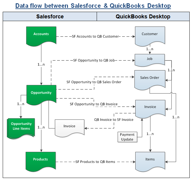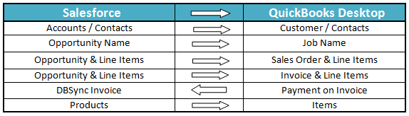 Integration data flow between Salesforce & QuickBooks Desktop is shown in the table below.