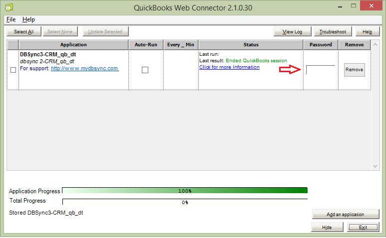 - Once you setup integration, go to your QuickBooks Web Connector by clicking on Start > Programs > QuickBooks > Web Connector. Then, click on the Password text box for profile DBSync3-CRM_QuickBooks_dt.