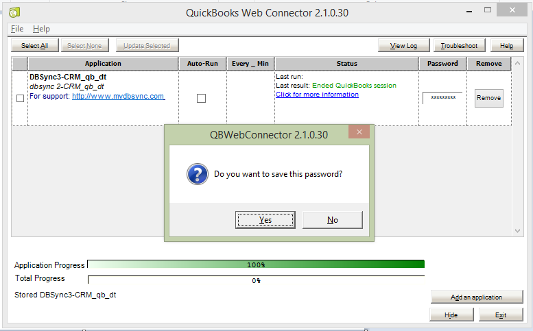 - Enter your DBSync Password in the text box and click Enter. A Message Box display will ask "Do you want to save this Password". Select the Yes button. DBSync Password will be saved in the Web Connector.