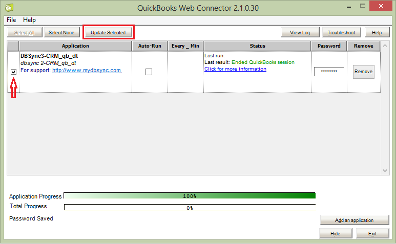 - Check the DBSync3-CRM_QuickBooks_dt check box and click on Update Selected button. This will start the sync and the process will complete automatically. Auto-Run can also be used in Web Connector to run integration at regular intervals. For example, if you select 60 minutes interval, after every 60 minutes integration will run by itself provided Web Connector is open.