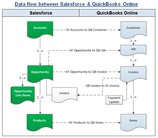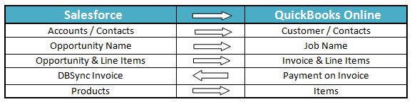 Integration data flow between Salesforce & QuickBooks Online is shown in the table below.