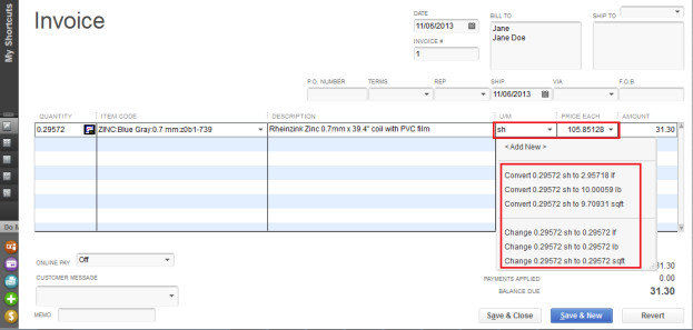 Once you've created a unit of measure set, and assigned it to an item, you can easily convert to other units of measure within the set when you add the item to a transaction. Continuing with the previous example, if you add the Cable item to an invoice with a quantity of 10 yards, you could then convert that quantity to 30 feet or 0.06 spools.