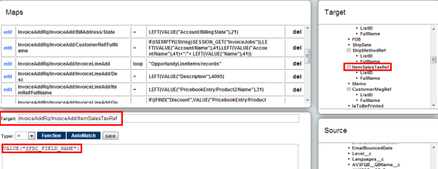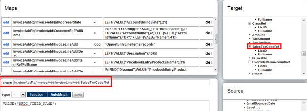 ItemTaxCode | Y | ItemSalesTaxRef | Y | This field should be on the Opportunity object and the NAME should match with the QuickBooksSalesTaxCode list at all times. |