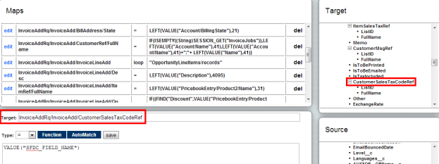 The customer Tax Code in QuickBooks holds the values Taxable Sales &Non-Taxable Sales. It could also hold custom values based on how QuickBooksCustomerTaxCode is configured. The corresponding field in SFDC needs to be at the Opportunity level and preferably has to be Text field with the data values matching with the QuickBooksCustomerSalesTaxCodeRef list.
