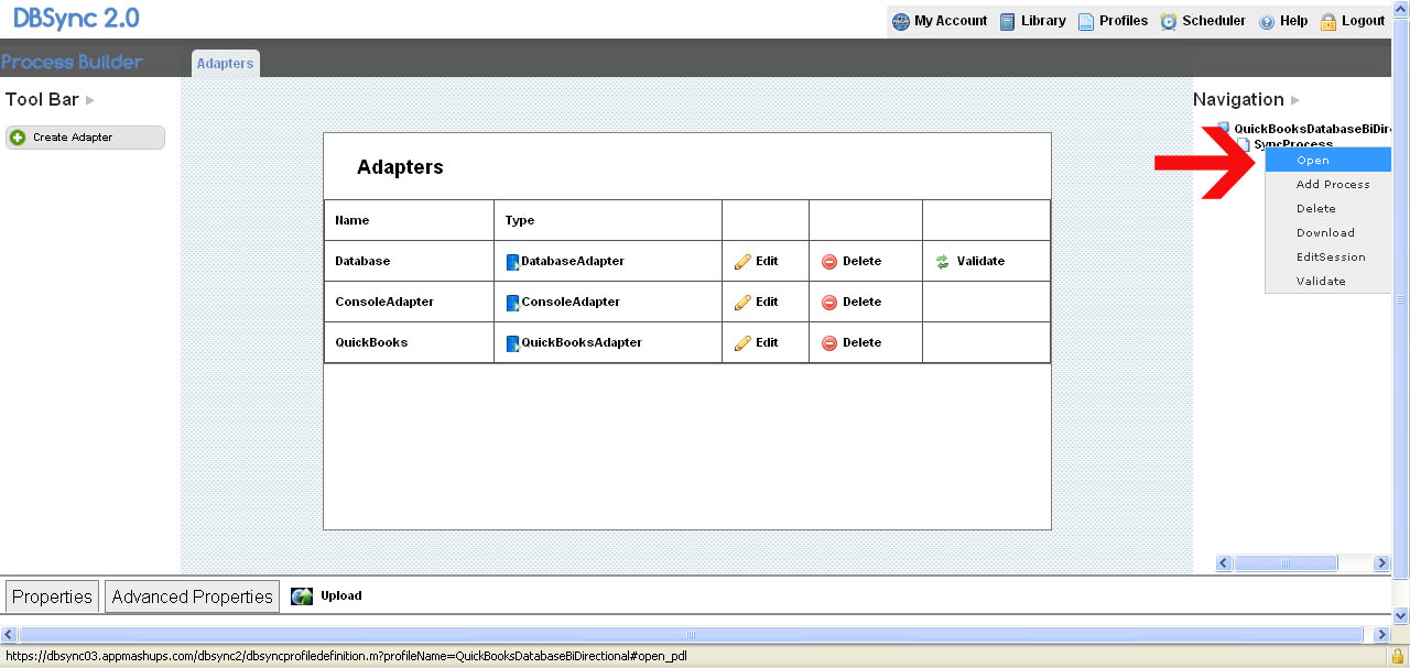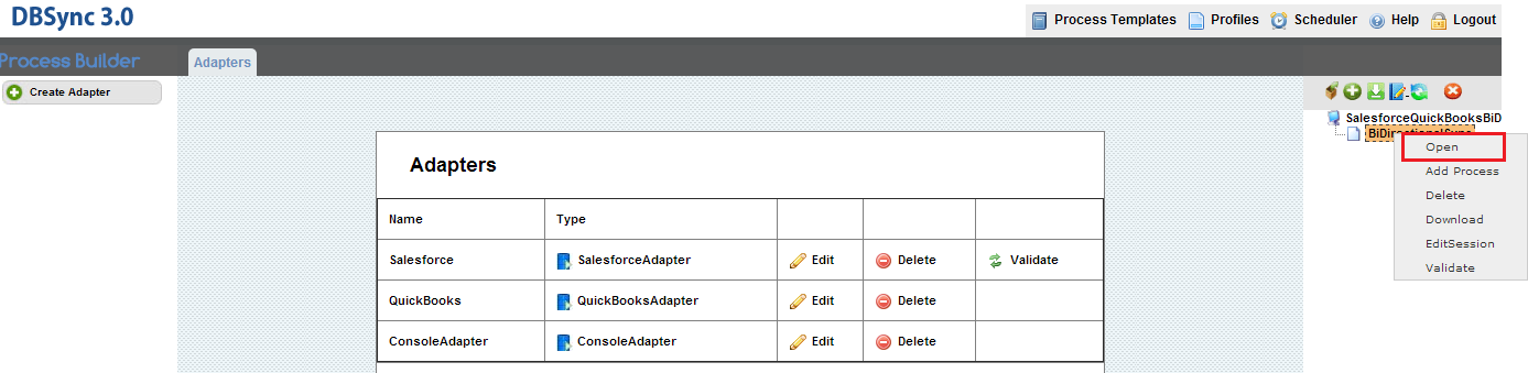 2. After naming the new process, right click on the process name under the Navigation bar and select the “open” option as shown in the screenshot below: