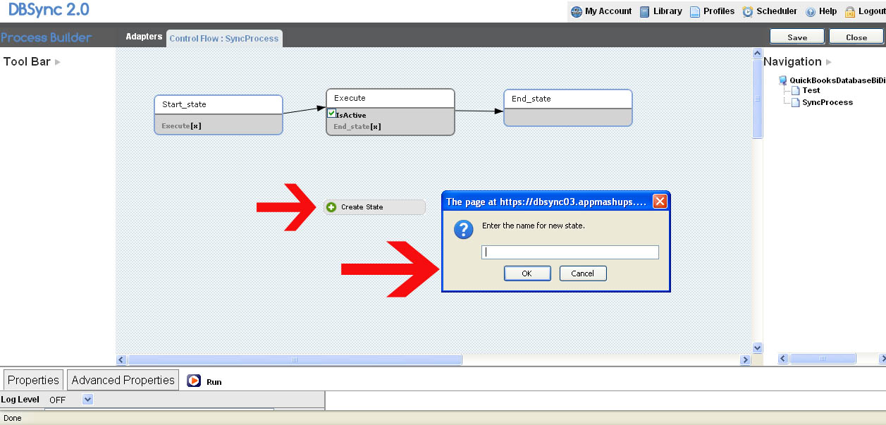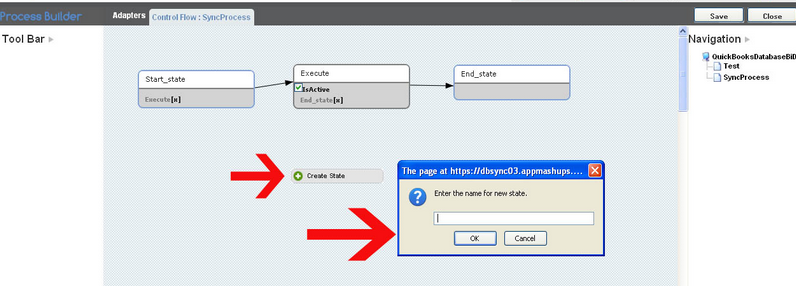 4. Next, Drag and Drop the “Create State” icon anywhere on the canvas (the canvas is the area known as the “Control Flow”) to create a new action as illustrated in the screen shot(below). A dialog box will also appear with the message “Enter the name for new state” Enter a name for the action that fits your business process.