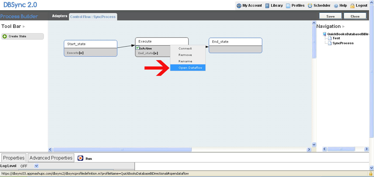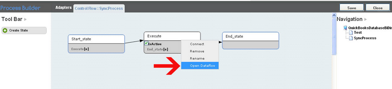 5. After naming the State that you created, the administrator or user can map their data flow by double clicking on the Action (aka state) that they created or by right clicking on the Action and selecting the “open data flow” option as shown in the screen shot below:
