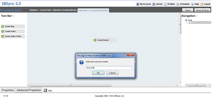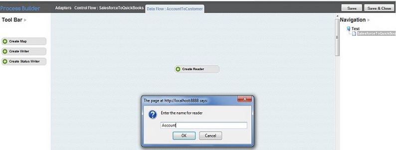 Note: The moment you try to drop the reader, map, writer or status on to your canvas you will be prompted to 'Enter the Name'. Until you enter a name, the user or administrator cannot proceed further.