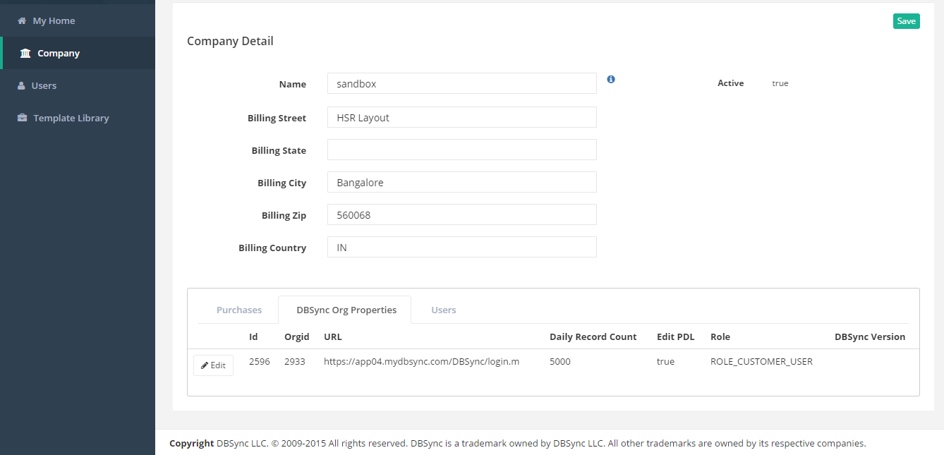 Company Tab: A user can update - Company's Name, Billing street, Billing state, Billing city, Billing zip, Billing country - and save the information on the DBSync server.