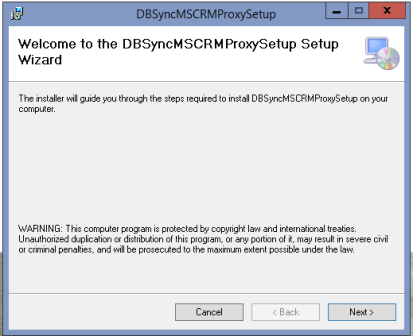 - Run setup file (DBSyncMSCRMProxySetup.msi) and follow instructions:
