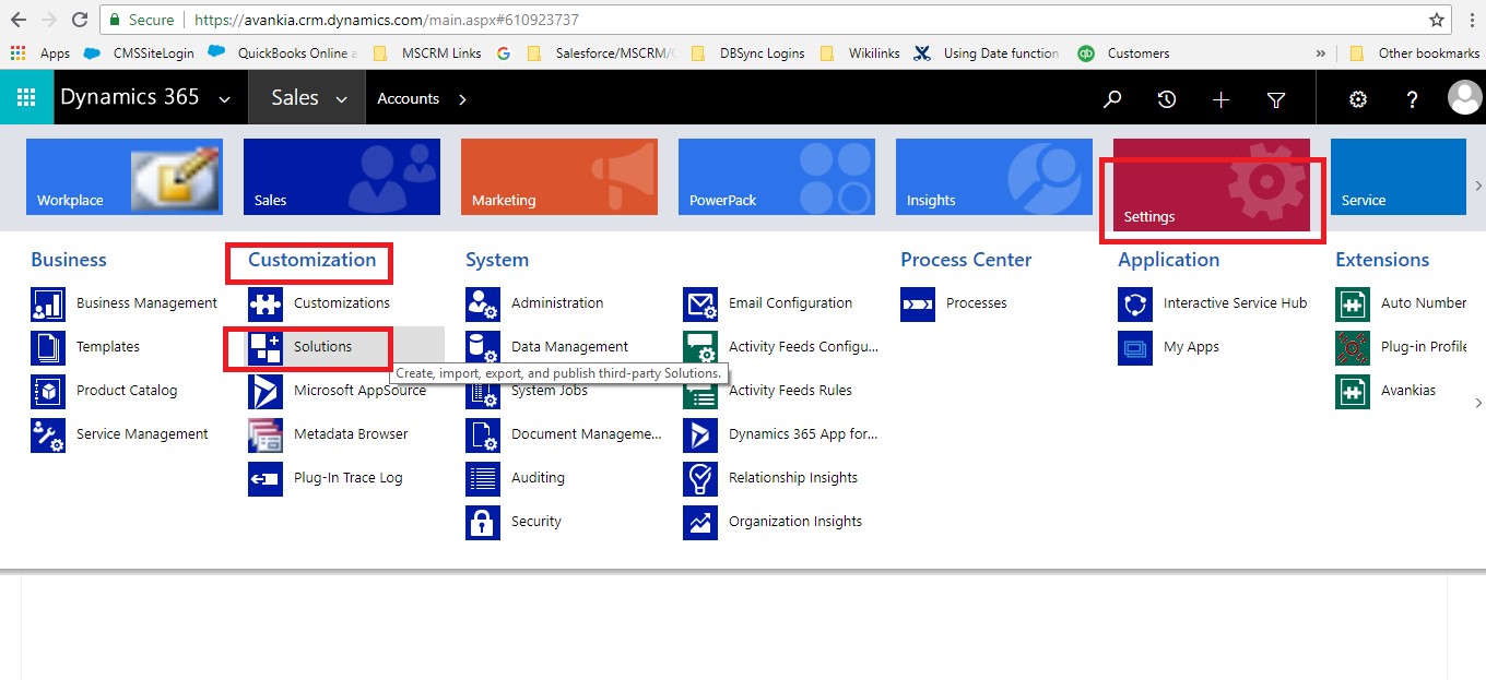 2.Go to Settings, Customization, Solutions and open it by clicking on it - as shown: