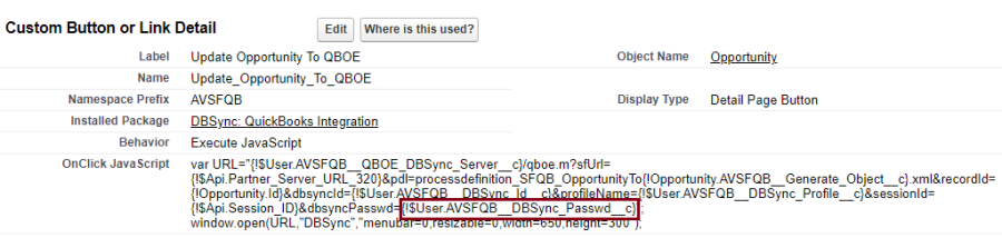 Copy the entire code of the existing button of the DBSync package and paste it in the newly created button and only replace this newly created password field’s API Name in the code and save it.