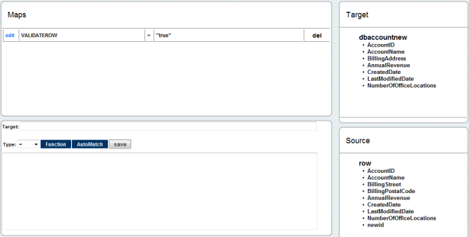 - Validate Row remains "true". AccountID, AccountName and AnnualRevenue from target is mapped with the value of source columns AccountID, AccountName and AnnualRevenue respectively.