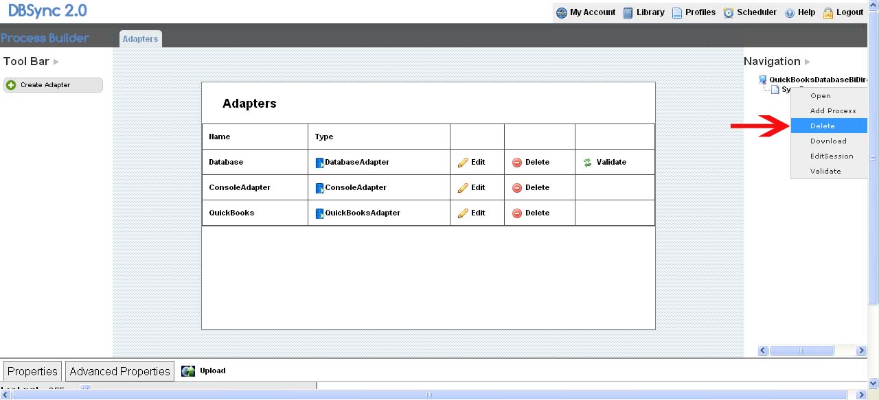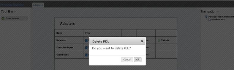 1. Right click on the Profile name under “Navigation” and select “delete” on the menu to delete the process definition. A pop up window displays a message for the deletion confirmation of the process definition file. Click on the “X” button on the confirmation message if you want to cancel the deletion, or select the “Cancel” button. Please see the series of screen shots below for an illustration of this process: