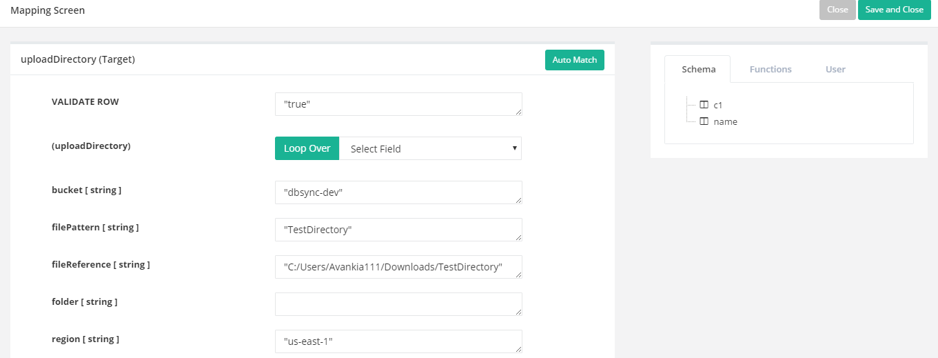 - Set the target Object to upload directory that will write the total chosen directory with its files from designated file system to Amazon file system.