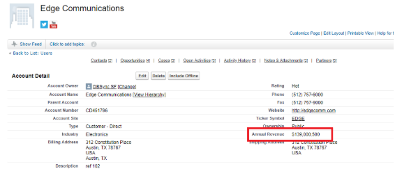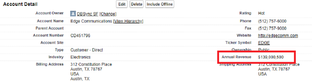 The Salesforce API provides exponential value when there are more than 8 digits in the currency field. As shown in the below screenshot, Annual Revenue is a currency field in Salesforce Account Object and value within that field is “139,000,000” which is more than 8 digits.