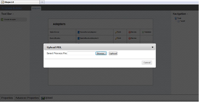 4. After finding the appropriate PDL (process definition language) file, click Upload to upload the file as illustrated in the screen shot below: