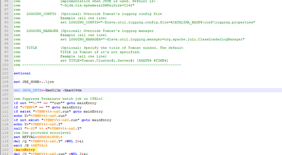 set JAVA_OPTS=-Xms512m -Xmx4096m before, or after, the line, set JRE_HOME=..\jre.