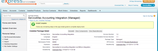 DBSync Package ServiceMax Accounting Integration is installed in ServiceMax Salesforce Instance. Pre-requisites and the steps involved in installation are explained in this section.