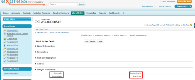 - Once the DBSync Package ServiceMax Accounting Integration is installed the below fields should be included in Page Layout as explained below.