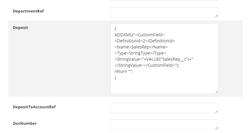 ADDXML("<CustomField><DefinitionId>2</DefinitionId><Name>SalesRep</Name><Type>StringType</Type><StringValue>"+VALUE("SalesRep__c")+"</StringValue></CustomField>");