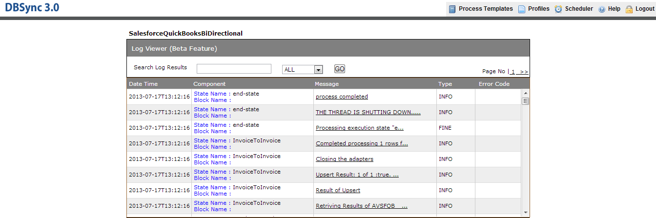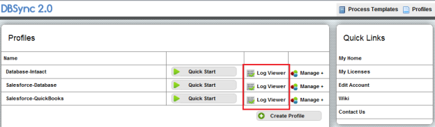 The log section within DBSync can be accessed from the menu link within a project. The screenshot below shows the log listing page.