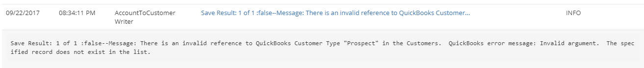 Description : It is very important that when you syncing a picklist value from an instance of Salesforce to QuickBooks or vice-versa, the picklist values should be exactly the same in both Salesforce and QuickBooks. Let's say you try to integrate between Salesforce instance and QuickBooks - where picklist values are not the same. Then, you get the following error from Logs of your project.