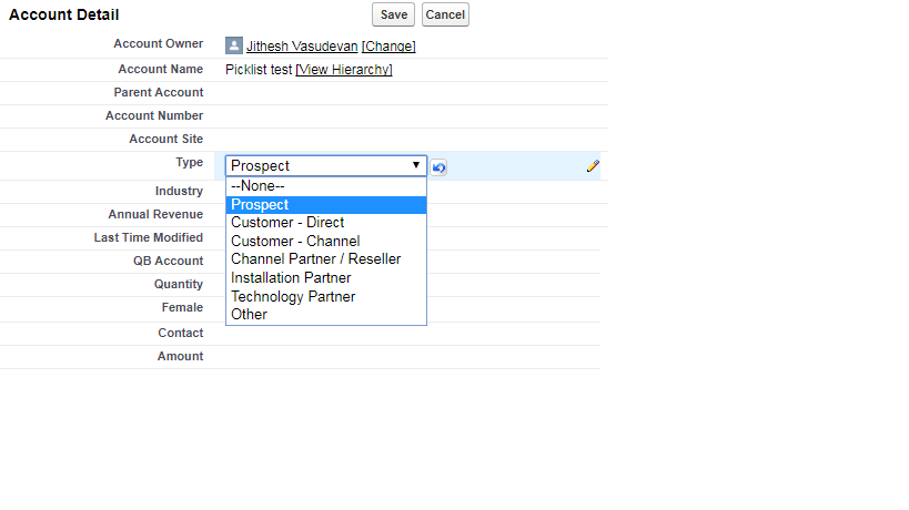 In Account object of Salesforce, the field "Type" has values shown in the following image: