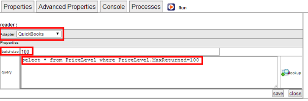 - In this new workflow, add the following query using Advanced Query Builder. Datasource should be QuickBooks. Batch size in properties will remain as 100 (default value).