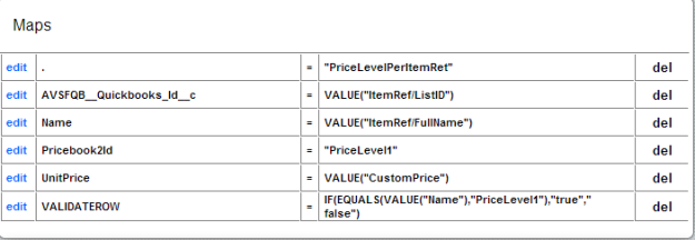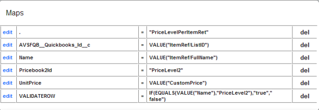 - Map the fields as shown below. Then, Save. Notice that, on the left side it has Target fields (Salesforce) and on the right side it has source fields (QuickBooks). PriceBook2 is the name of Salesforce PriceBook and PriceLevel2 is the name of the QuickBooks Price Level.