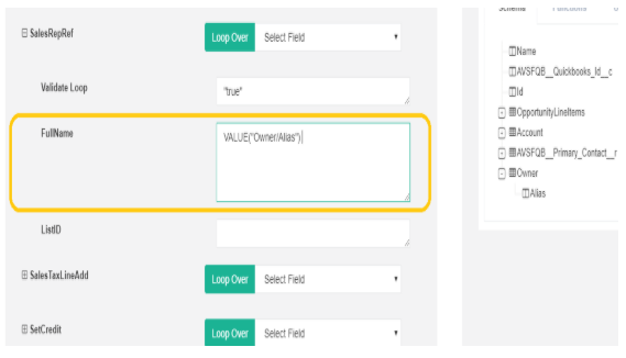Above, the field is shown for the “OpportunityOwner”. This Alias field of the opportunity owner will be mapped to Quickbooks as a “rep”.