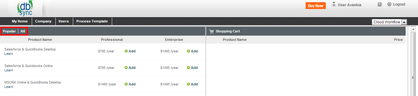- To purchase Adapters, go to www.mydbsync.com and click on Customer Login. Enter your Username and Password and click Sign in. Then, click on 'Buy Now'. Click on Process Templates link from the top menu. Note: If you have already purchased the adapters then you need not follow these steps.