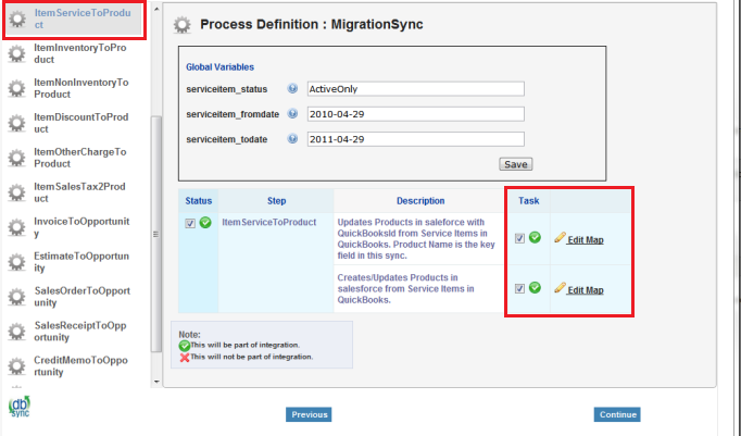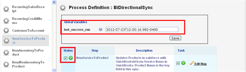 - To migrate QuickBooks Items to Salesforce Products, click on Processes > SalesforceQuickBooks:Bidirectional > turn on ItemServiceToProduct work flow. In the “Last Success Run” edit the date from which you want to Migrate the data. Click on Save.
