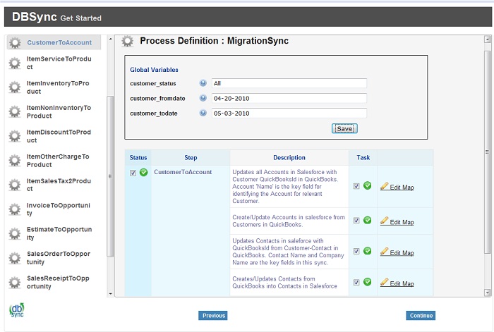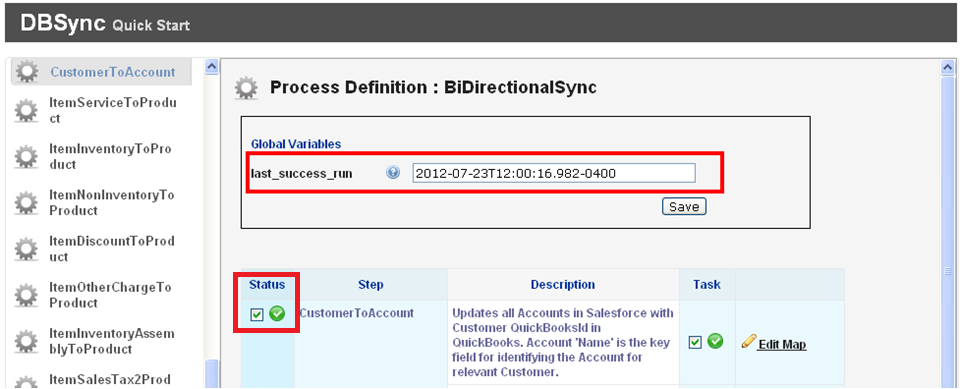 - To migrate QuickBooks Customer to Salesforce Accounts, click on Processes > SalesforceQuickBooks:Bidirectional > turn on CustomerToAccount work flow. In the “Last Success Run”, edit the date from which you want to Migrate the data. Click on Save.
