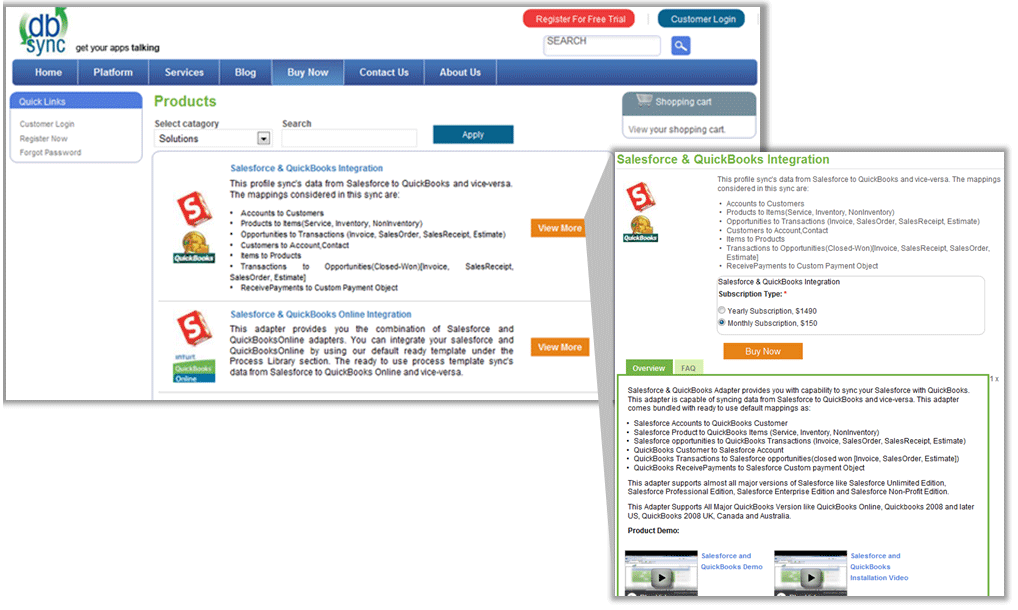 Shopping cart is a new addition in website www.mydbsync.com. Shopping cart will enable users to review and purchase Adapters, Solutions and Process from www.mydbsync.com website.