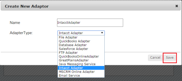 - Click on Create New Connector. Enter the Connector name as Sage Intacct. Select the Connector type as Sage Intacct Adapter and click Save.