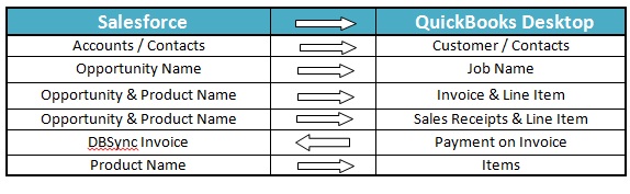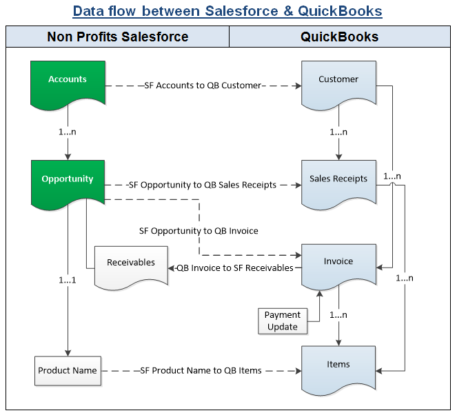 Data flow of unidirectional integration between Salesforce Non Profit Success Pack & QuickBooks Desktop is shown in the table below. The integration streamlines inserting a new record in QuickBooks Desktop.