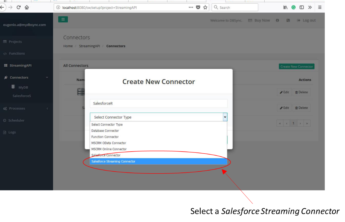 In order to create a Salesforce Streaming connector, simply press the button Create New Connector, and select the type Salesforce Streaming Connector.