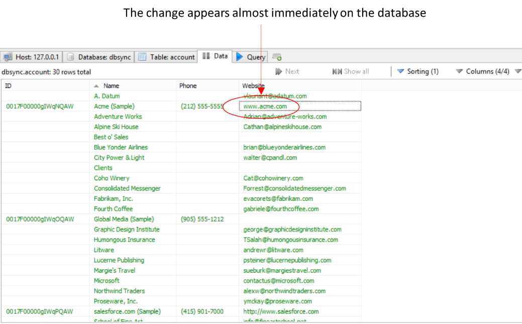 The advantages of the Salesforce Streaming Connector can be easily seen by changing the value of, for example, the website of an account: the change is almost immediately reflected in our MySQL database.