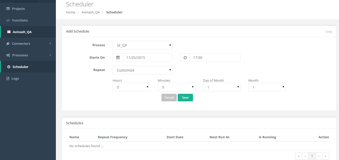 - To create a scheduled job, select a process to create a schedule. Select a date range and a repeat factor and Save.