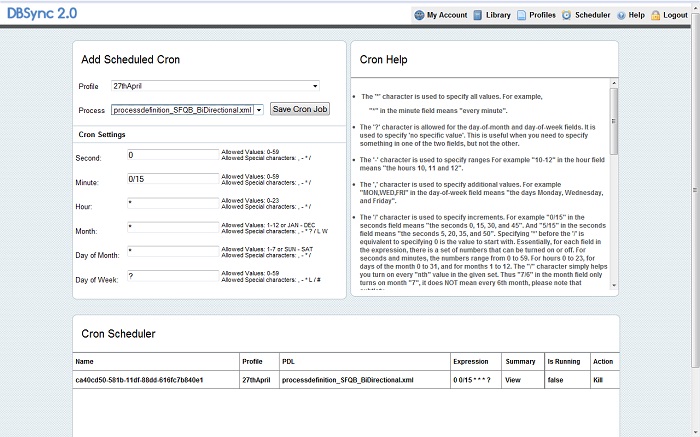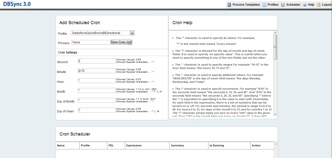 The scheduler allows a user to add a process to a job scheduler (also referred to as a “cron”). This enables database synchronizations to occur automatically (as per the time scheduled by the user).“Cron Settings” refers to a time at which a user sets the process to perform the synchronization.