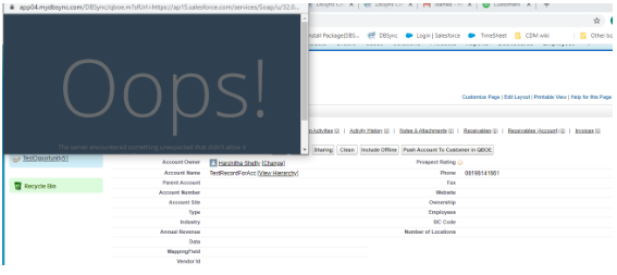 When inserting an Account from Salesforce to Quickbooks as Customer using the QBOE button the user might get an error saying ‘the server encountered something unexpected that didn’t allow it to complete the request’ error which in turn will redirect to the page shown below.