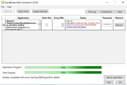 1. Actually that error means someone else is updating the company file and they are in single user mode or performing an operation that locks the company file. QBWC cannot access the company file at that time. QBWC will try again the next time it runs.